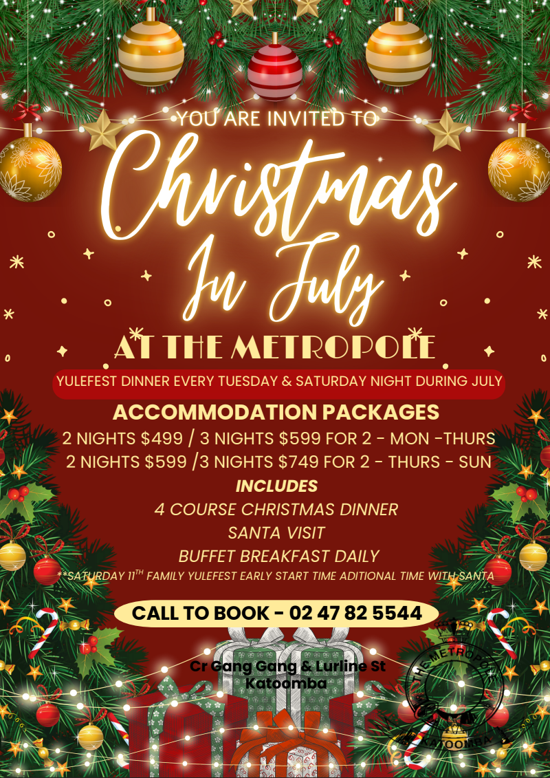 Celebrate christmas in July this year with us at our sister hotel The Metropole Guesthouse See our christmas in July packages below. Including accommodation, breakfast daily, and a 4 course christmas dinner and a visit from Santa Claus!